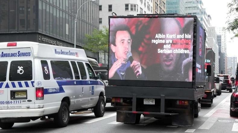 Tri kamiona su se na dan početka zasedanja Generalne skupštine UN neprestano kretali po Menhetnu i kroz Tajms skver, a na njima je bio emitovan video snimak kojim se uz potresne scene, ukazuje na tešku situaciju u kojoj se nalazi srpski narod.